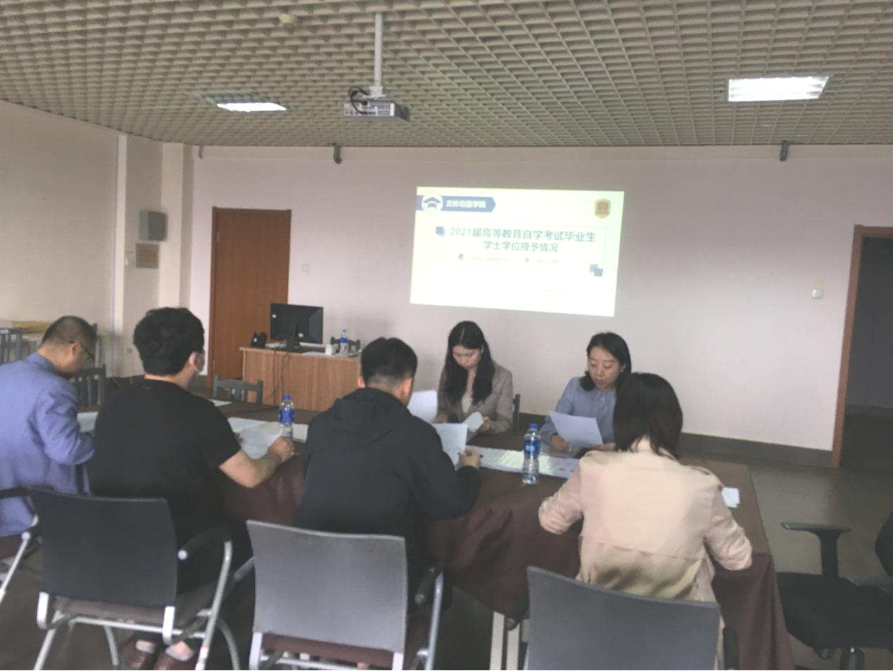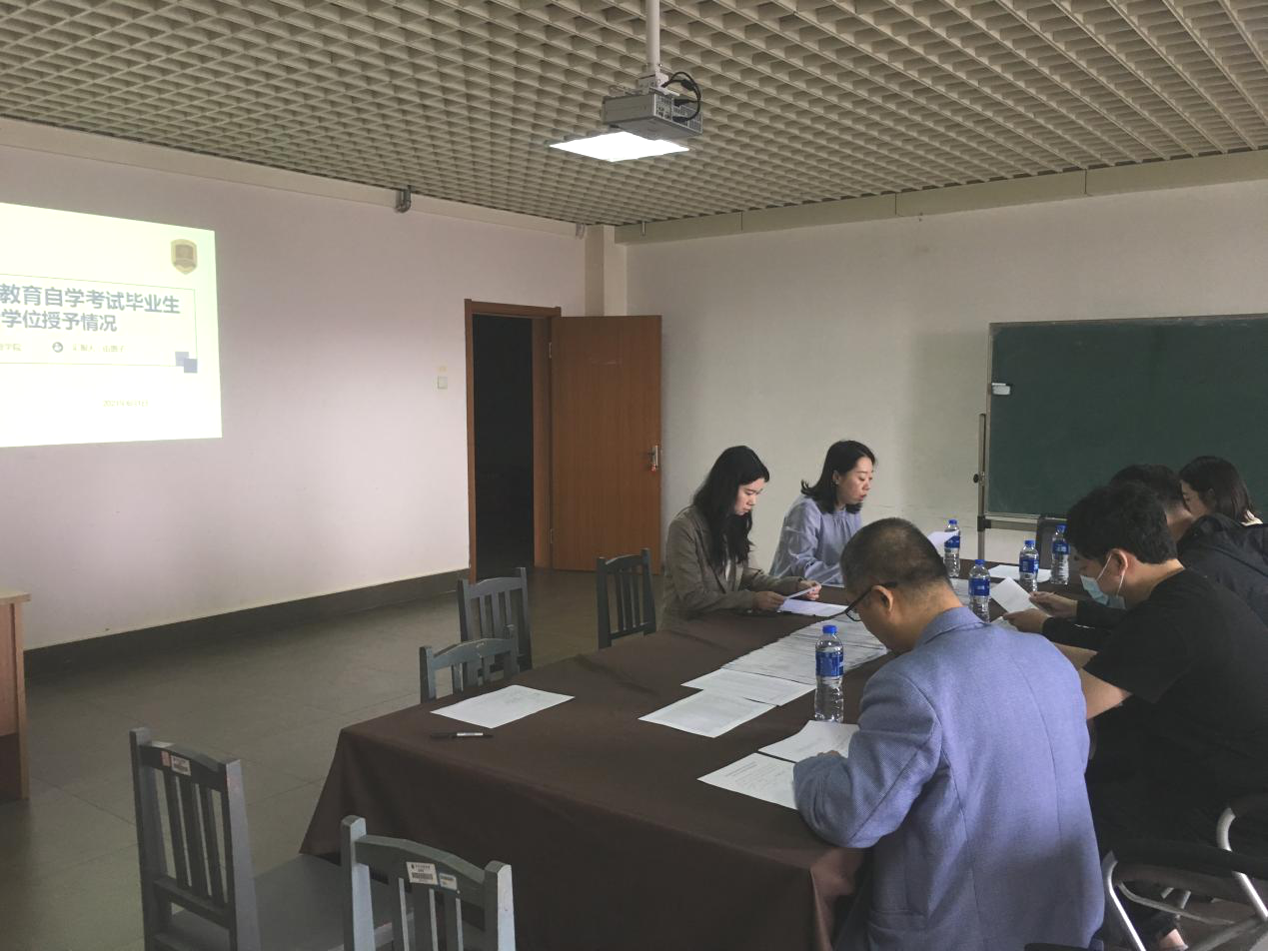 继续教育学院于2021年6月1日(星期二)召开了2021届自学考试毕业生学士学位授予资格审查会议,游戏学院学位评定分委员会主任委员葛莹莹以及李岩、吕巍、范立平,继续教育学院综合办全体行政人员参加会议。